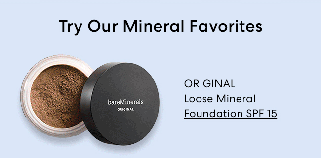 * For a limited time, get 15% off your purchase on bareMinerals.com and at bareMinerals boutiques. Use unique code in email at checkout and offer will be applied. Offer valid for 15 days after receipt of this email. Offer valid only on bareMinerals.com, bareMinerals boutiques or through our Customer Care Center by calling 888-795-4747. Offer not valid at bare+BEAUTY Outlets or at any other retail store, website, salon or spa. This offer may not be applied to previous purchases, gift card purchases or on bareMinerals MADE-2-FIT Fresh Faced Liquid Foundation. Not valid in combination with other offers. We are unable to ship outside of the United States and its territories and Canada at this time. We reserve the right to cancel any order due to technical error or unforeseen problems. Ongoing offers are subject to change without notice. Void where prohibited.